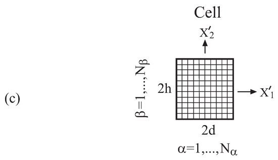 The set of Equations (38)–(55) defines a boundary value problem in the transform domain. These equations can be solved by the methods that have been presented in detail in Chapter 11 of [15] for functionally-graded materials. Thus, the representative cell domain , is divided into several rectangular sub-cells, , ; see Figure 1c. The transformed displacement vector and temperature are expanded into second-order polynomials, and the equilibrium and heat equations, interfacial and boundary conditions are imposed in the average (integral) sense. This results in a system of algebraic equations, the solution of which provides the transformed thermal and mechanical fields. The actual fields at any point within the cells of the considered rectangular region , can be determined by the application of the inverse transform, which for the displacement vector (for example) is given by: