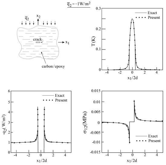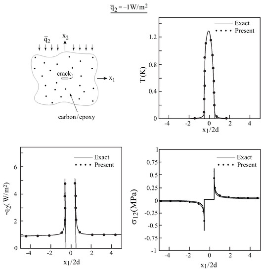 Here, also, let the homogenized composite be subjected to a remote heat flux = W/m in the two-direction. In Figure 3, comparisons between this exact solution and the present one for the unidirectional carbon/epoxy composite whose axis of symmetry is oriented in the out-of-plane X-direction with a transverse crack are shown. Very good agreements between the two solutions for the temperature, heat flux and the induced shear stresses along the crack line can be well observed.