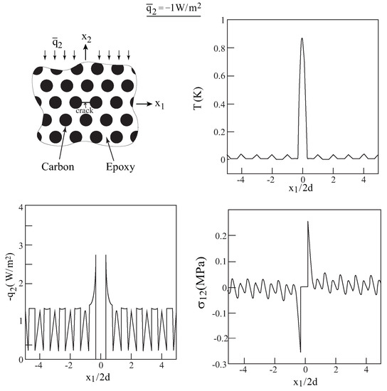 Consider a unidirectional fiber-reinforced composites that consists of carbon T300 fibers reinforcing an epoxy matrix. The volume fraction of the reinforcing fibers is . The properties of the constituents, as well as the effective properties of the homogenized unidirectional composite, predicted by the HFGMC micromechanical model, are given in Table 1. Let the axial direction of this homogenized composite be oriented in the one-direction, and a crack of length 2a/(2d) = 1 is introduced along this direction; see inset in Figure 2. The homogenized composite is subjected to a remote heat flux = −1 W/m in the two-direction. Figure 2 shows a comparison between the temperature, heat flux and the induced shear stress along the crack line as predicted by the exact solution of [7] and the present approach. Very good agreement can be observed. It should be noted that only shear stress exists along the crack line, whereas along this line. This is in agreement with the result of [20] who showed that in a cracked isotropic material that is subjected to a remote heat flux, only Mode II deformation exists.