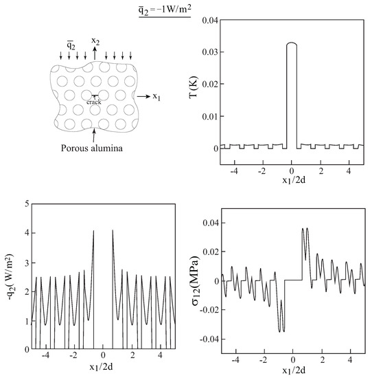 In the next application, cracked porous alumina in which the porosities are distributed such that they form a hexagonal array is considered; see the inset in Figure 6. The porous alumina is subjected to a remote normal heat flux = W/m. The properties of the alumina (AlO) are given in Table 1, and the amount of porosity is 0.25. For this uncracked porous material, the HFGMC micromechanical model predicts the following values of the effective thermal conductivities (that are needed in Equation (36): = = 20.76 W/(mK). It is assumed that a crack that connects two adjacent pores exists. It length is 2a/(2d) = 0.7.