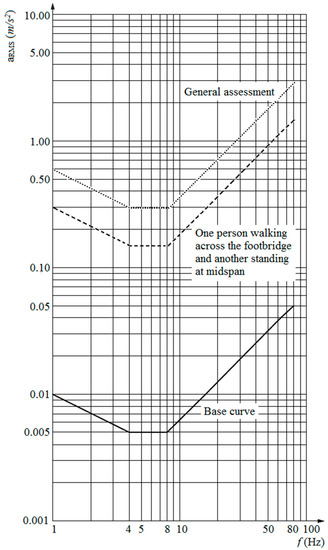 Other design guidelines, however, do not use peak acceleration, but rather, apply the root-mean-square (RMS) acceleration to verify the level of admissible vibrations. EN 1990 [9], the Eurocode basis of structural design, allows a maximum RMS acceleration of 0.7 m/s2, and a smallest natural frequency of 5 Hz for comfort criteria. ISO 10137 [10] guidelines for serviceability in buildings suggests using the curves presented in Figure 3. This guideline permits higher RMS accelerations when a general assessment of footbridge vibrations is performed than to the scenario of a person standing at midspan while another crosses the footbridge.