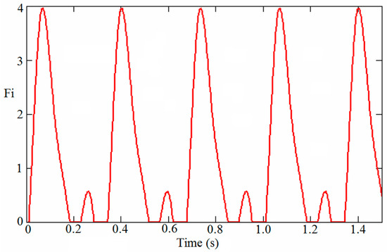 In Equation (2), Fm is the maximum value of the Fourier series, which is given by Equation (3); fmi is the amplification factor due to heel impact; Tp is the step period; and C1 and C2 are coefficients defined by Equations (4) and (5), respectively.