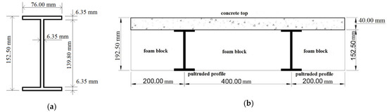 The slab system used in this study is shown schematically in Figure 6. Narrow flanged (NF) I-section GFRP profiles with the dimensions shown in Figure 6a have been selected. The foam (expanded polystyrene or EPS) blocks used for filling are non-structural and have been cut for a perfect fit; they have the usual dimensions employed in precast concrete slabs. The profiles and the foam blocks serve also as formwork for the wet concrete. They are designed to sustain constructive loads, avoiding thus the use of bracing.