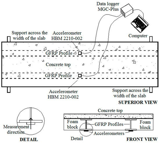 Three types of vibration tests were performed on the slab prototypes: (i) heel-drop, (ii) walking and (iii) jumping. The test setup and instrumentation utilized are illustrated in Figure 7. Vertical accelerations were measured at midspan by means of two accelerometers, placed at the bottom of the GFRP profiles, connected to a data acquisition system. Data were acquired at a time interval of 0.01s, thus, frequencies up to 50 Hz could have been recorded. A total of five volunteers, whose characteristic data are given in Table 6, participated in the tests. All volunteers used soft sole shoes during the tests.