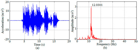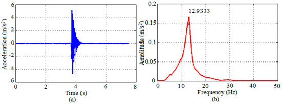 Response of Prototype II to heel-drop performed by Volunteer 4 in terms of graphs: (a) acceleration along time; (b) respective spectrum.
