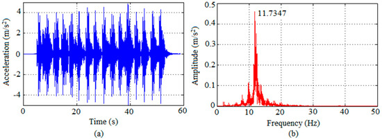 The jumping load described in Section 2 (obtained by multiplying Fi(t), shown in Figure 5, by the person’s weight, G) was applied distributed over two areas, corresponding to the shoe/slab contact area, at the center of the numerical model, in the same position as applied in the experiments. The results for jumping are shown in Figure 16, for the test performed by Volunteer 4, in terms of graphs of acceleration along time and its respective spectrum. From the acceleration spectrum it can be observed, again, that the slab responds primarily at its fundamental mode. The peak accelerations obtained numerically reached at most 9.47 m/s2 with RMS of 3.29 m/s2. These values are much higher than the limit values given by Figure 2 and Figure 3.