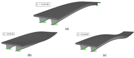 The experimental and numerical analyses indicated that the composite slab responded primarily in the first vibration mode (flexural mode), as can be seen from the frequency spectrum shown in Figure 10, Figure 12, Figure 15 and Figure 16. The natural frequencies for the second and third modes of vibration (26.00 and 41.08 Hz) did not show significant amplitudes.