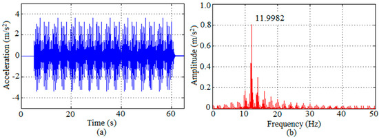 Response of Prototype I to walking performed by Volunteer 4 in terms of graphs: (a) acceleration along time; (b) respective spectrum.