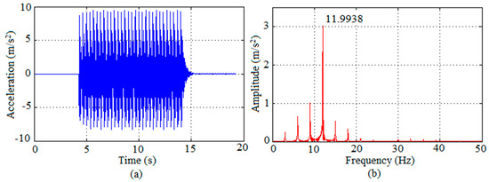 Response of Prototype II to jumping performed by Volunteer 4 in terms of graphs: (a) acceleration along time; (b) respective spectrum.