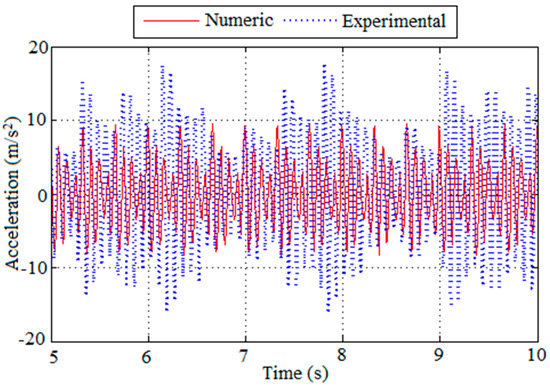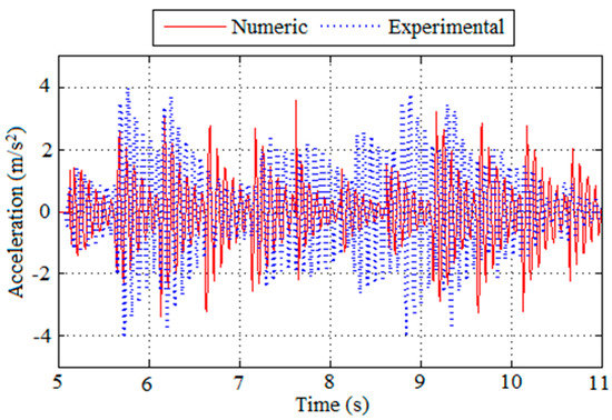 The comparison between the experimental and the numerical results in terms of accelerations obtained for the walking load from Volunteer 4 can be visualized in Figure 17 for the initial cycles. Despite the good agreement, the results from the experimental test in terms of high peak acceleration (5.03 and 4.85 m/s2) are around 35% greater than the results from the numerical model (3.6 m/s2). This difference is also observed for the RMS accelerations, when comparing 1.30 to 0.97 m/s2, found from the experimental and numerical analysis, respectively.