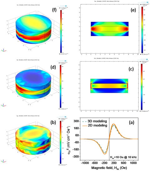 Magnetoelectric coefficients obtained with the equation for a piezoelectric fraction of 0.5, and those resulting from the simulation of a two-layer structure with 8 mm in-plane dimension, and 2 mm thickness with both layers 1 mm thick (same 0.5 piezoelectric fraction) are compared in Figure 2. Agreement is surprisingly poor, as the simulation resulted in values much lower than those anticipated from Equation (5). Indeed, a maximum value of ~700 mV·cm−1·Oe−1 is obtained with the analytical solution, while a value of ~85 mV·cm−1·Oe−1 results from simulation. No significant change of the coefficients was found by simulation when the conductivity of the spinel oxide was decreased from 0.1 S/m down to 1 × 10−10 S/m. Therefore, the difference must be associated with the actual inhomogeneous strain fields present in the structure that are neglected by the analytical solution. This underlines limitations of using Equation (5).