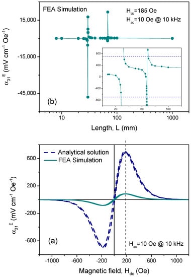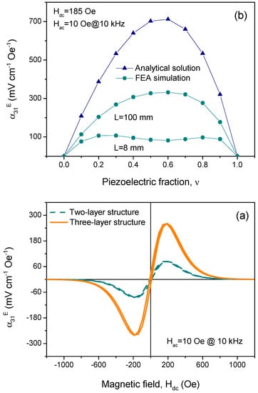 Specifically, several previous works reported a good agreement between the analytical solution for the bilayer and experimental results for three-layer structures [15]. However, simulations show that such structures do not have the same response for a given geometry, as it is illustrated in Figure 3, where 8 mm long, 2 mm thick structures with a piezoelectric fraction of 0.5 are compared. It is found that the three-layer structure shows a significantly higher maximum α31E than the two-layer one: ~260 mV·cm−1·Oe−1 against ~85 mV·cm−1·Oe−1. This further corroborates the reported agreements to be basically coincidental.