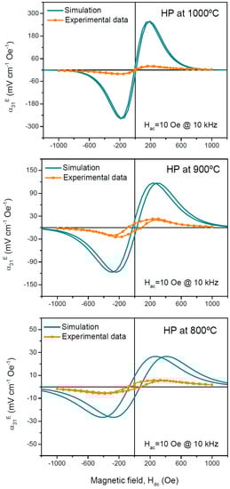 Results of the simulations with the material coefficients corresponding to processing at 1000 °C, 900 °C, and 800 °C for three-layer Bi0.36Pb0.64Sc0.36Ti0.64O3/NiFe2O4/Bi0.36Pb0.64Sc0.36Ti0.64O3 structures with 8 mm length and 3 mm thickness, with all layers 1 mm thick, are compared in Figure 4 with reported experimental data for analogous 8 mm diameter disc samples. Maximum α31E values of 21, 24, and 8 mV·cm−1·Oe−1 were obtained in the ceramic composites spark plasma sintered at these temperatures [18]. Note that figures do not coincide with those reported in [18], for the piezoelectric thickness was used in that case to normalize the magnetoelectric response. It is surprising that a higher coefficient was achieved for the material processed at 900 °C than in that processed at 1000 °C, in spite of the piezoelectric layer presenting lower piezoelectric coefficients. Indeed, simulations indicate that the magnetoelectric coefficients are expected to diminish with decreasing processing temperature, following the piezoelectric coefficients. This result was already noted in [18], and associated with the triggering of microstructural degradation in the magnetic layer at 1000 °C.