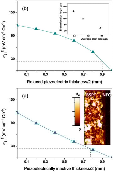 In relation to the second mechanism, that is, the occurrence of strain relaxation across a distance shorter than the total thickness of piezoelectric layers, this was also studied by simulation of five-layer structures incorporating outward, fully-relaxed piezoelectric layers of varying thickness. Basically, the initial three-layer structure was maintained inward, and two outer piezoelectric layers were added with the same material coefficients of Bi0.36Pb0.64Sc0.36Ti0.64O3 but, for the elastic compliance, were increased by three orders of magnitude. This causes negligible stresses to develop in the external additional layers under the magnetically-generated strains. Results are shown in Figure 5b for the material coefficients corresponding to processing at 900 °C. Magnetoelectric coefficients decrease as the thickness of the relaxed outer layers increases, so that the experimental value is obtained for a thickness of ≈0.9 mm. This would mean that strain relaxation takes place across a thickness of ≈100 μm, which is far larger than the grain size of ~1 μm [18].