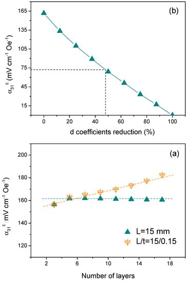 Nevertheless, and notwithstanding poling issues, thickness reduction below the characteristic strain relaxation length has been shown to be an effective means of enhancing the magnetoelectric response of composites. Additionally, simulations also showed that further enhancement can be obtained in multilayer structures if the length is increased at the same time bilayers are added in order to maintain a constant length to thickness ratio of 15/0.15 A continuous increase is found in this case up to 182 mV·cm−1·Oe−1 for a 17-layer structure, as is illustrated in Figure 6a.