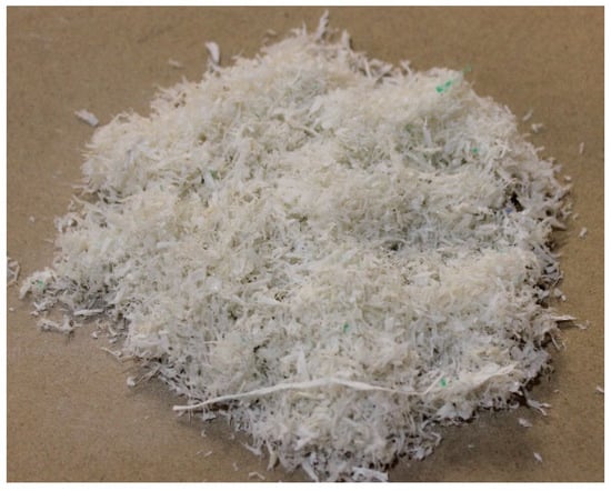Bags were manually cut into pieces approximately 200 mm × 200 mm and then shredded using a Castin laboratory scale granulator. Salt was removed from the resulting plastic strands (Figure 2) by washing them with dishwashing liquid in hot water before being rinsed thoroughly and oven dried at 105 °C for a minimum of 24 h.