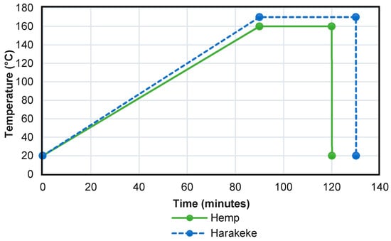 Separation of hemp and harakeke fibre was carried out using alkali treatment in a lab scale digester. Alkali treatment of natural fibres reduces average fibre diameter and removes non-cellulose constituents that do not contribute significantly to the fibres mechanical properties. Sodium hydroxide (NaOH) powder and sodium sulphite (NaSO3) pellets, with a purity level of 98% were acquired from Scharlau Chemie S.A. (Barcelona, Spain). Oven dried hemp or harakeke fibres were weighed into 90 g samples and carefully placed into one of four steel canisters used to contain the fibre/solution mixtures inside the larger pressurized tank of the digester. For hemp fibres, a solution containing 36 g of NaOH and 684 mL of water was mixed in a conical flask. Four batches of this solution were prepared and combined with the fibres inside the canisters immediately prior to treatment. For harakeke fibres, the solution containing 36 g of NaOH, 14.4 g of NaSO3 and 670 mL of water was prepared for use in a similar way. Figure 3 shows the temperature profiles used for both harakeke and hemp fibre treatment. An investigation conducted by Efendy et al. [] had previously determined that these treatments provided an optimal temperature profile for the aforementioned fibre species.