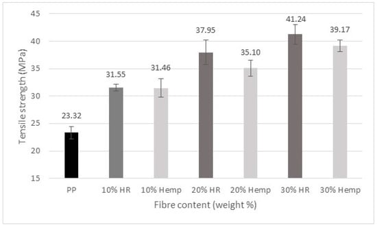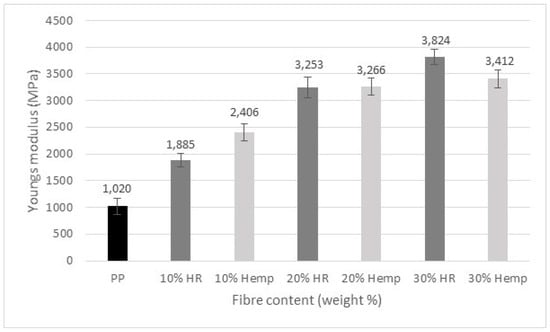 The tensile strength and Young’s modulus for PP/natural fibre composites are shown in Figure 6 and Figure 7. The 30 wt % harakeke samples showed the most significant improvements in strength and Young’s modulus of 77% and 275% respectively compared to plain post-consumer PP. Furthermore, values were generally higher than for those found using pre-consumer PP studied in a parallel study including that of the PP only filament which had strength and Young’s modulus values which were 6% and 14% higher than the pre-consumer PP only filament respectively []. Although investigation into the different grades is necessary, the increased mechanical properties could be due to the polyester fibre content within the post-consumer polymer.