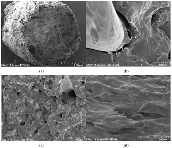 SEM micrographs were found to support that although fracture surfaces of the 3 mm printing filament contained only small voids (Figure 14a), those in the dried printed filament were relatively larger (Figure 14b) compared with the printing filament, with those in the undried printed filament (Figure 14c) relatively larger still and more plentiful.