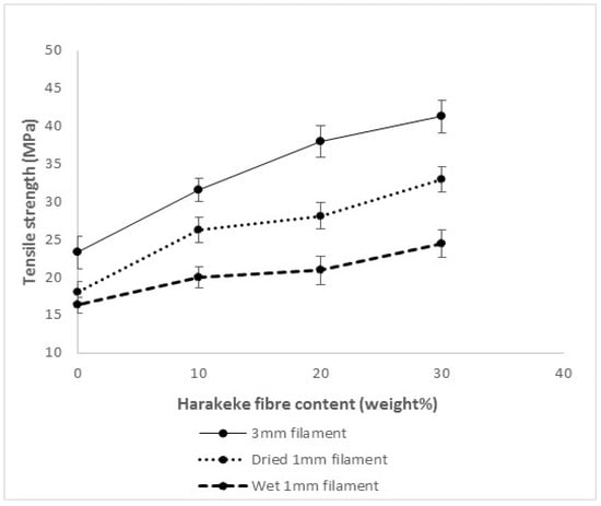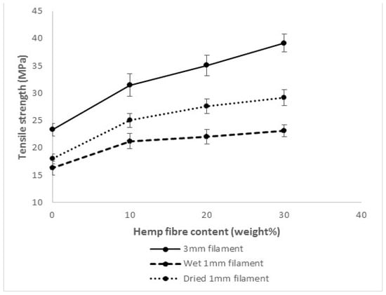 Figure 9, Figure 10, Figure 11 and Figure 12 show the strength and Young’s modulus data obtained for 1 mm diameter hemp and harakeke fibre/PP 3D printed material compared to that obtained for the 3 mm diameter printing filament. A significant reduction in properties occurred when the filaments were printed. One possible explanation was the moisture absorbed from the air into the 3 mm filament prior to printing. To investigate this further, 3D printed filament was printed after the filament was dried at 105 °C for 24 h for which the data is also shown in Figure 9, Figure 10, Figure 11 and Figure 12. A mass balance was used to measure the weights of undried and dried filament samples prior to printing, the results of which are summarised in Table 1.