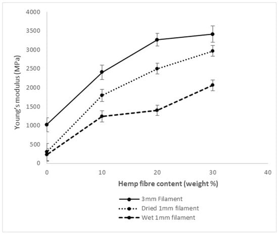 Young’s modulus comparison between hemp reinforced 3 mm, 1 mm wet and 1 mm dry filaments.