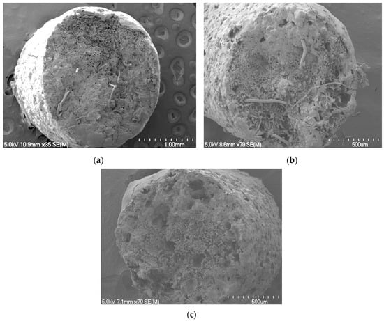 Fracture surfaces of (a) 3 mm printing filament, (b) 1 mm printed filament produced with pre-dried filament, and (c) 1 mm filament produced without pre-drying with 20 wt % harakeke.