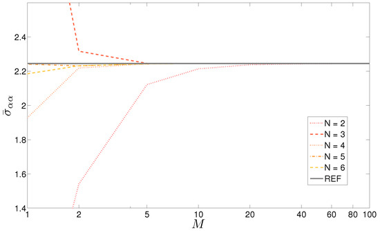 Case 2, simply supported composite laminated cylindrical shell with thickness ratio . Stress vs. number M of mathematical layers introduced for different orders of expansion N for the exponential matrix. REF means 3D solution by Ren [34].