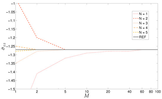 Table 3 shows the displacement and the stress for the three-layered rectangular plate. Both of the quantities are given as dimensionless values and calculated in the middle. The displacement is evaluated for a plate whose thickness ratio is , while the stress is for a structure with . In this case, the introduction of M mathematical layer is unnecessary. Actually, when , the convergence is reached just by means of an opportune increase of the order of expansion N. For the thinner plate, is sufficient for the stress to reach the convergence; the thicker plate needs an higher value (). The introduction of a certain number M of mathematical layers helps to reduce the expansion order N. However, for the computational point of view, the first procedure is more convenient. The comparison underlines the fact that an increase in N value is needed as the thickness increases with respect to the shell dimensions. The convergence of the stress with increasing values of M is shown in Figure 4 for several orders of expansion N.