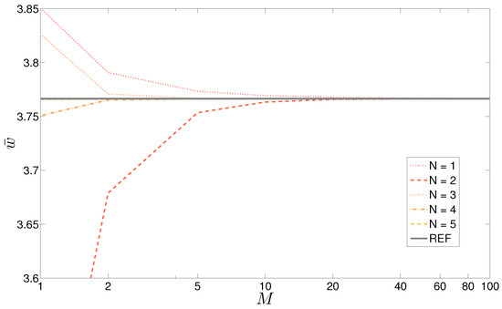 Table 6 is for the last case about a three-layered spherical shell. Only the displacement is investigated. The dimensionless values are given for a thick () and for a thin () structure. An increase in the expansion order of the exponential matrix is not sufficient without the introduction of a certain number of mathematical layers. As the investigated quantity is the same in both cases (the displacement), this study easily investigates the effect of the thickness. The coupled values of M and N needed to obtain a better description of the phenomenon increase with the thickness. When the thickness is small (compared to the shell dimensions), mathematical layers coupled with allows for the solution to be reached. On the other side, the thicker shell needs at least mathematical layers with an expansion of the exponential matrix equals . Figure 7 confirms the trend shown in Table 6 for the displacement of the thinner shell: the results move close to the exact value as the order of expansion is increased.