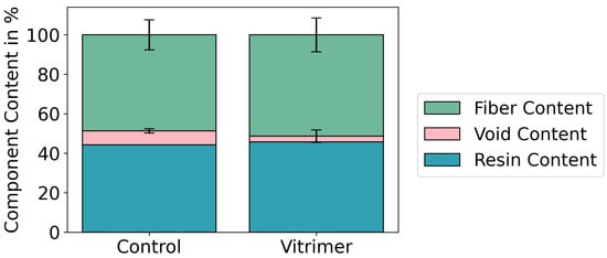 Microscopy and image segmentation revealed differences in void content and fiber volume fraction of the control epoxy and towpreg vitrimer specimens, as shown in Figure 2. The higher void content in the wet wound control specimens was a result of the wet winding process. Previous work has shown that flexural strength can decrease by 5–10% for each 1% increase in void content in carbon fiber–epoxy composites [14]. The lower void content in the vitrimer towpreg material enhances its mechanical performance compared to the control specimens, resulting from superior load transfer between the matrix and fibers. p-values were calculated based on t-tests to determine statistical significance and revealed that the difference in void content was significant (p = 0.0027), while the difference in fiber volume fraction was not (p = 0.4767).