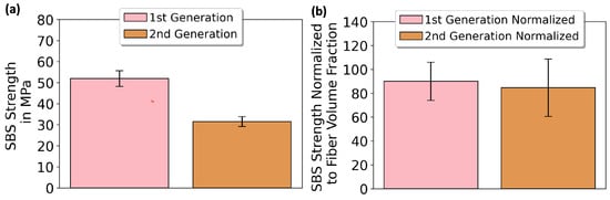 Figure 4a displays the first- and second-generation SBS data, including normalization. The remanufactured tube exhibited lower SBS strength compared to its first-generation counterpart, although this was consistent with the differences between dry and wet winding [14]. The wet winding process introduces additional defects due to the variability in resin infiltration and compaction compared to the uniform consolidation in a prepregging process. To compare similar resin systems produced via different filament winding processes, a method was devised to normalize the SBS strength to the fiber volume fraction. Different methods of this normalization have been reported [15,16], but the goal in the present study was to ensure a valid comparison of properties. Results of dividing the SBS strength of the composites by the respective fiber volume fractions is shown in Figure 4b. Once normalized, the strengths were comparable, indicating that the remanufacturing process did not inherently reduce strength. Prepregging the recovered fibers would restore the prior fiber volume fraction, and thus, the mechanical properties of the composite. A previous COPV recycling demonstration (Voith Composites) demonstrated 80–90% retention of strength in short CF tapes [8]. Following normalization, the present method retained 94% of the first-generation composite.