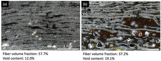Figure 5. Light microscopy images of (a) towpreg vitrimer specimen and (b) remanufactured vitrimer specimen.