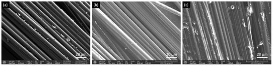 A major concern of composite recycling processes centers on possible detrimental effects on recovered fibers, as harsh recycling processes can damage CFs, leaving down-cycling as the only viable option [17]. Figure 6 shows micrographs of virgin fibers compared to two different sections of the remanufactured tube. The outer layer refers to the layer of the tube in direct contact with the dissolution liquid. The inner layer refers to the layer in contact with the mandrel and, therefore, the last material the solution penetrates. The absence of fiber damage indicates our mild conditions preserve integrity, unlike high-temperature methods that cause surface degradation, although the inner layer contained matrix residue. This excess material could be deemed either tolerable or intolerable. For the reuse of the recovered CFs with a matrix different than the first-generation composite, clean fibers can be expected to eliminate issues with adhesion based on the immiscibility of different polymers. However, when re-winding with the same resin, the resin may bond equally well to the matrix residue in regions as to fibers with sizing.