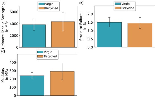 Single-fiber tensile testing elucidated the extent of performance retention following recycling. Figure 7 shows values for tensile strength, strain-to-failure and modulus values for tested fibers. The recycled fibers exhibited similar mechanical properties compared to the virgin fibers and are not statistically significantly different (p = 0.262). The standard deviation was larger for recovered fibers compared to virgin fibers from the supplier, indicating minor defects associated with the processing. The aforementioned DEECOM project yielded fibers with only 94 % strength retention at higher temperatures, compared to our reported method [18]. The acidic recycling solution did not interact with the carbon backbone of the fibers, thereby allowing for the retention of strength. The dissolution process involved mild conditions that did not damage the fibers, offering the possibility of genuine recycling, as opposed to down-cycling CFs. Full details of the recycling process are presently proprietary (Mallinda Inc., Denver, CO, USA). The retention of mechanical properties of the fibers explains the equivalence between the first- and second-generation SBS results after normalization (Figure 4b) because the fibers were not damaged in the recycling process.