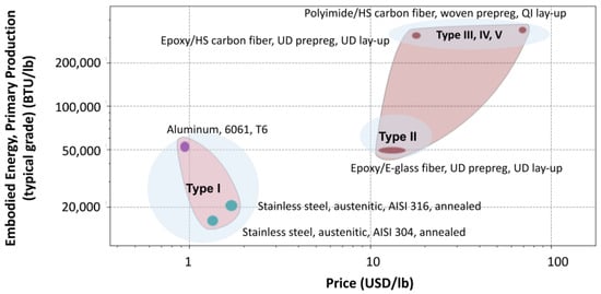 Major considerations affecting the design of future COPVs include fiber costs and embodied energy. Due to the high pressures required for efficient hydrogen use, Type IV tanks, which feature polymeric liners and a full CF overwrap, are necessary. Figure 8 shows the price of component materials and the embodied energies as a function of tank type. CF production involves process temperatures exceeding 3000 °C, and thus CFs have a high embodied energy (183–286 MJ/Kg) [19]. Type IV tanks require more CF than Type III vessels to withstand similar loads, resulting in even greater embodied energy. Recovering and recycling fibers from COPVs can divert these materials from landfills and recover the embodied energy.
