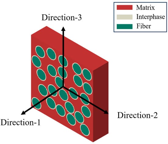 Following the construction of the RVE, the mechanical model is validated by assessing the mechanical properties and volume fractions of every constituent phase, as summarized in Table 1. These values were obtained from reference [38]. Although the properties of the fibers found in the current literature are presented in an isotropic material, the computational model established in Section 2.1.2 for transversely isotropic fibers are still holds true.
