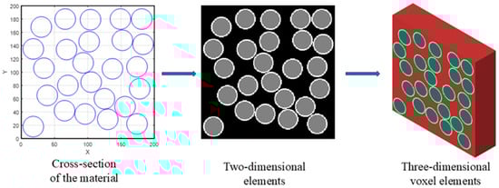 The main limitation of using voxel grids lies is that the boundaries of the grids are either horizontal or vertical, making it difficult to accurately simulate the boundaries of curves. While this discretized representation results in a geometric discrepancy compared to the actual cylindrical fiber morphology, the associated error diminishes significantly when the fiber radius surpasses ten element lengths (R ≥ 10 elements). Finally, the two-dimensional mesh is extended along the fiber axis to create a comprehensive three-dimensional voxel grid. To optimize the allocation of computational resources, a high in-plane resolution is utilized to precisely represent the cross-sectional geometry of the fibers and interphases, and a relatively coarser discretization is implemented in the fiber direction. The procedure for generating the RVE is presented in Figure 2.