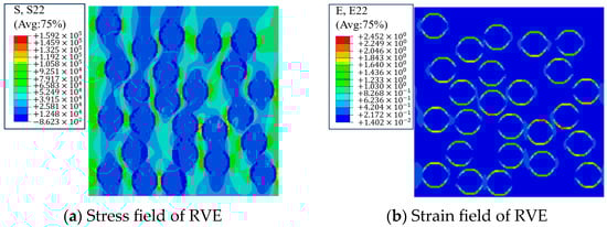 Taking the computational result of E22 as an example, the corresponding field of stress and strain is illustrated in Figure 3. Here, the maximum tensile stress within the fibers occurs along the loading direction, while the maximum strain occurs transversely to the loading direction. When fibers are sufficiently close in the direction parallel to the applied load, their individual stress-concentration zones overlap and increase in intensity; a concomitant increase is also experienced in strain. Therefore, optimizing the arrangement of the fibers, such as implementing a hexagonal packing configuration, has the potential to improve the effective stiffness of the composite.