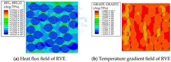 Analogous to the calculation of effective mechanical properties, PBCs are imposed on the RVE. In detail, a prescribed temperature is fixed at one end of the RVE and a steady surface heat flux is applied to the opposite face, enabling the calculation of the effective thermal conductivity. Taking the calculation of k22 as an example, the resulting heat flux field and temperature gradient are illustrated in Figure 4.