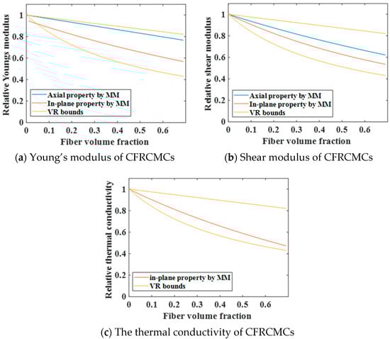 In the current theoretical frameworks employed for predicting the effective properties of multiphase materials, the apparent behavior is assumed to be governed solely by the intrinsic properties and volume fractions of the constituent phases, with the intrinsic properties fixed at the outset of material design. For CFRCMCs characterized by a prescribed fiber–interphase volume ratio, once the fiber volume fraction is specified, the effective properties can be unambiguously determined, thereby enabling the construction of the material’s cross-property relations.