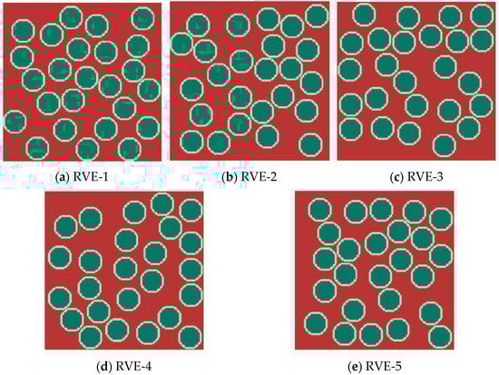 For the present material, considering the fiber diameter, the dimensions of a single voxel unit are established at 0 . 47   μ m . Consequently, the fiber diameter corresponds to 20 voxel units, while the interface phase thickness is 2 voxel units. The RVE is thus determined to have a size of 155   ×   155   ×   50 voxels, which translates to a physical size of 72 . 85   μ m   ×   72 . 85   μ m   ×   23.5   μ m . To substantiate the selected RVE size, it is essential to clarify the impact of random fiber distribution on effective material properties. Accordingly, five RVEs are generated at the phase volume fractions corresponding to the pristine material, varying solely in the spatial configuration of the fibers. Figure 7 illustrates the phase distributions within each RVE, with the fiber, interphase, and matrix phases represented by green, white, and red colors, respectively.