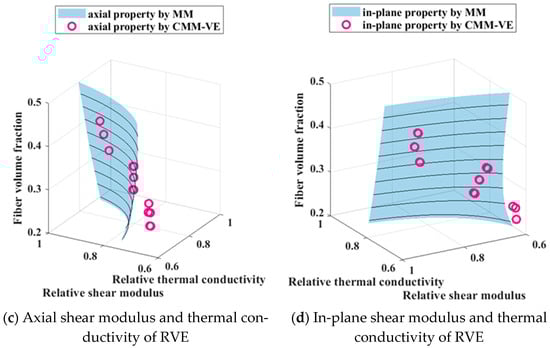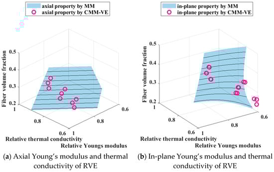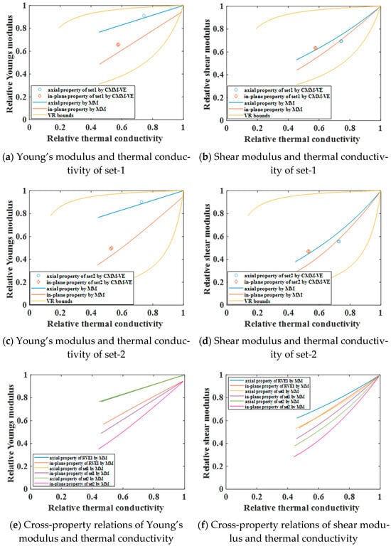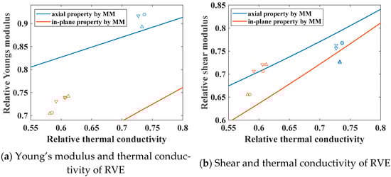 Finite element analysis was performed on the generated RVEs, and the computed properties were subsequently compared with the established cross-property relations. The results are presented in Figure 8. It should be noted that the axial shear modulus and the in-plane thermal conductivity did not completely correspond. The axial cross-property relations established are those between G12, G13, and k11, and the in-plane cross-property relations are those between G23 and k22, k23.