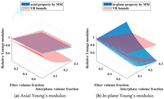 Additionally, the present model exhibits certain discrepancies in the estimation of the in-plane Young’s modulus. The effective properties of each composite are jointly influenced by the fiber volume fraction and the interphase volume fraction. As a cross-property relation eliminates only one independent variable, the fiber volume fraction is adopted as the Z-axis, thereby permitting the three-dimensional surface representation of the cross-property relations in the property space. Based on these calculated effective properties, the corresponding cross-property relations are subsequently established, as illustrated in Figure 13.