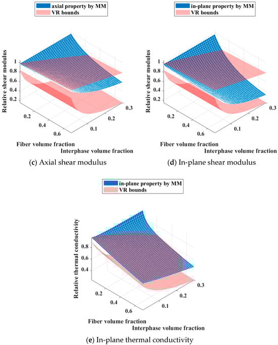 As illustrated in Figure 12, the effective properties predominantly remain within the VR bounds, indicating the validity of the calculations. Nevertheless, there are instances during the computational process where some properties surpass the VR bounds. This is primarily attributed to inappropriate volume fraction configurations, such as an exceptionally low fiber content coupled with a relatively high proportion of interphase. It is also worth noting that for CFRCMCs with varying fiber-interphase volume ratios, the thickness of the interphase will affect the surface/volume ratio of the equivalent fibers, and thus may have an impact on their effective properties and corresponding cross-property relations.