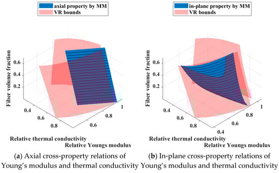 As illustrated in Figure 13, apart from localized regions where the in-plane cross-property relations between Young’s modulus and thermal conductivity marginally exceed the VR bounds, the entire surface remains within the theoretical limits, providing a preliminary validation of the results. Contour lines are further superimposed on the surface. For a composite with a prescribed fiber volume fraction, intersecting the cross-property surface with a horizontal plane at the corresponding height yields the desired curve of cross-property relations for that material. The figure further reveals that, with the selected material parameters, every cross-property relation except for the axial relation between Young’s modulus and thermal conductivity exhibits a marked decrease in the slope of its curve as the fiber volume fraction diminishes. This progressive flattening induces the surface to curl toward a configuration that is increasingly parallel to the thermal conductivity axis.