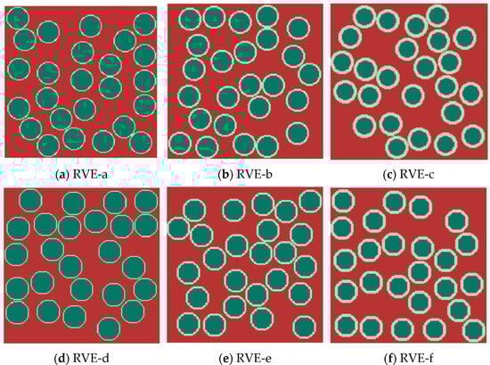 Determining an appropriate RVE size is essential to ensure the reliability of FEA. An RVE that is insufficiently small is unable to adequately represent the stochastic characteristics of fiber distribution, while an excessively large RVE imposes prohibitive computational demands. Heinrich et al. conducted a systematic investigation into the impact of RVE size on the predicted effective properties, concluding that a statistically significant RVE for unidirectionally random fiber distributions should encompass no fewer than twenty-five fibers [37]. Consequently, most of the RVEs utilized in this study contain twenty-five fibers. The validity of this selection is further supported in Section 3.1.2, where the predicted responses of multiple RVEs are analyzed; the slight variation observed among the results indicates that the chosen RVE dimensions are representative. This study examines the stochastic phase distribution, specifically concentrating on the random arrangement of fibers within the matrix. It is important to note that the interfacial layer on the surface of the fibers in actual CFRCMCs exhibits a non-uniform nature. However, the thickness of this interfacial layer is significantly less than that of the fiber itself. As a result, both the fiber and the interphase are modeled as coaxial cylinders within the RVE.