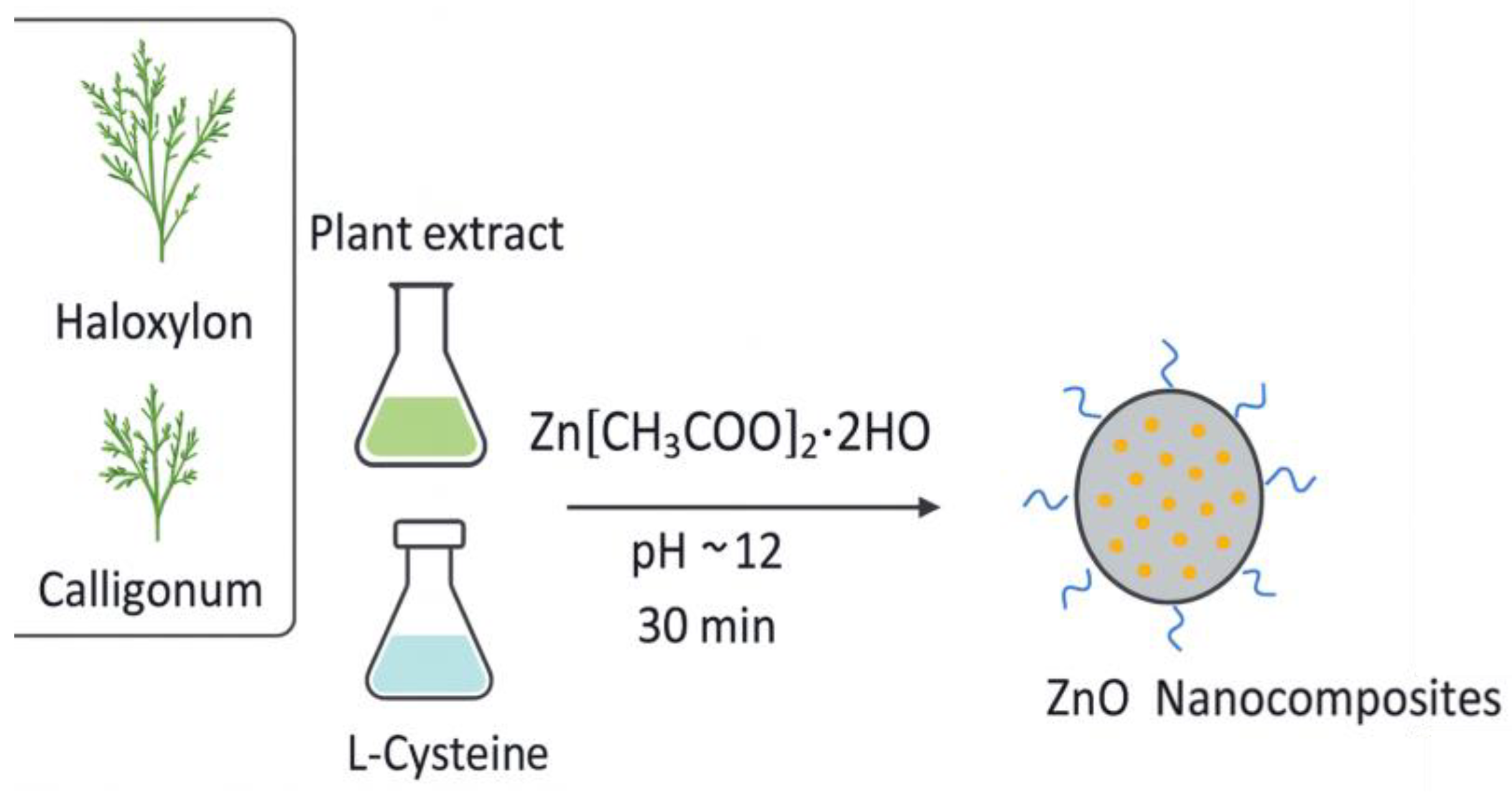 2.3. Preparation of Green ZnO Based Nanocomposites Using Plants Extract/L-Cysteine
