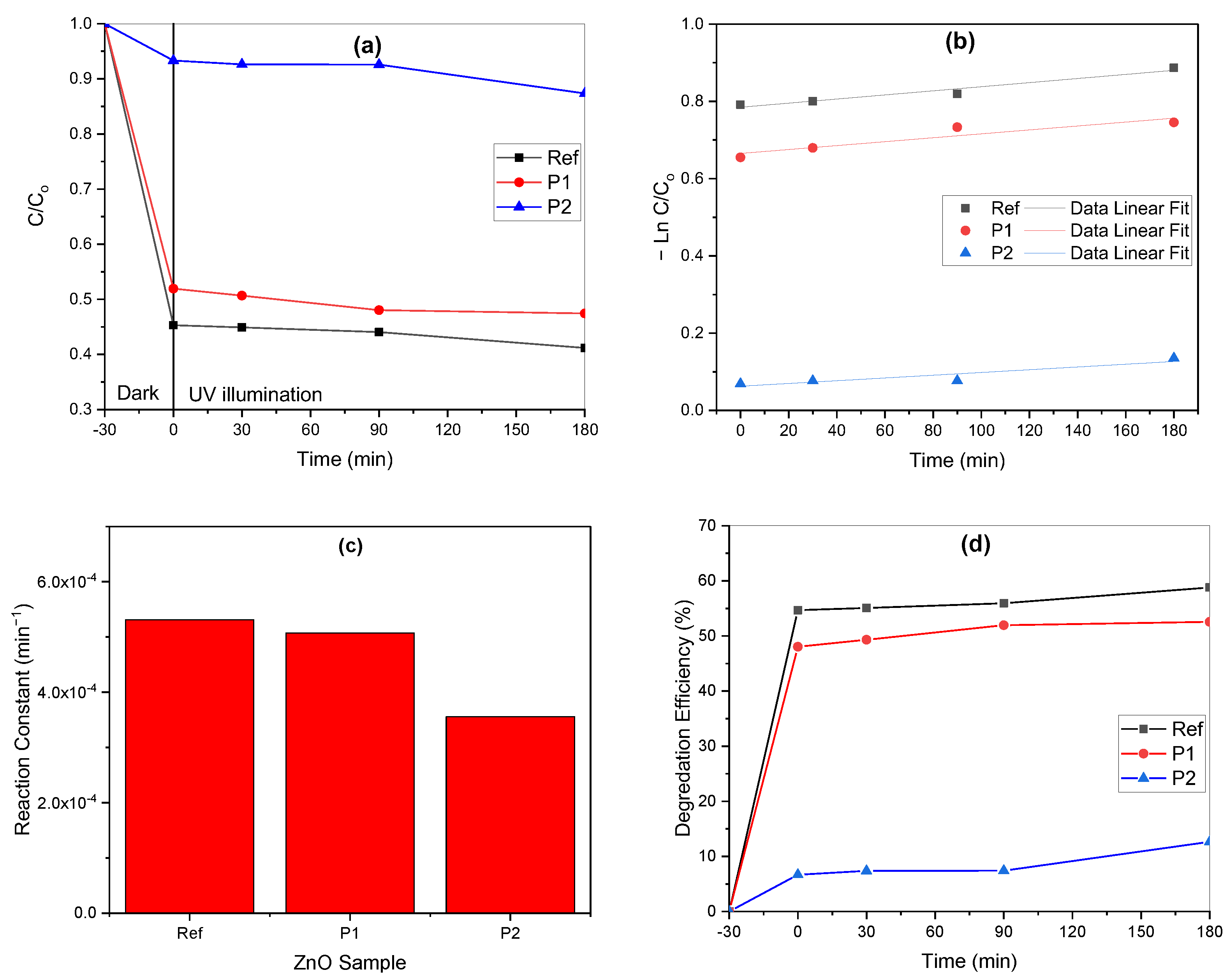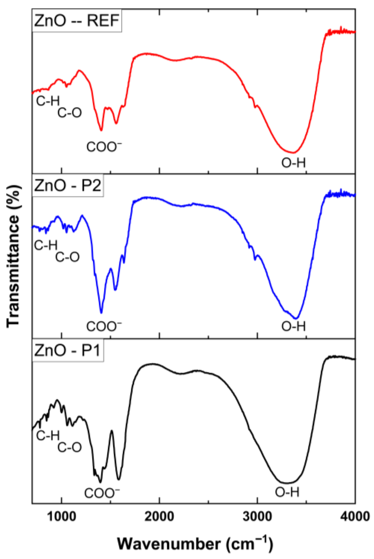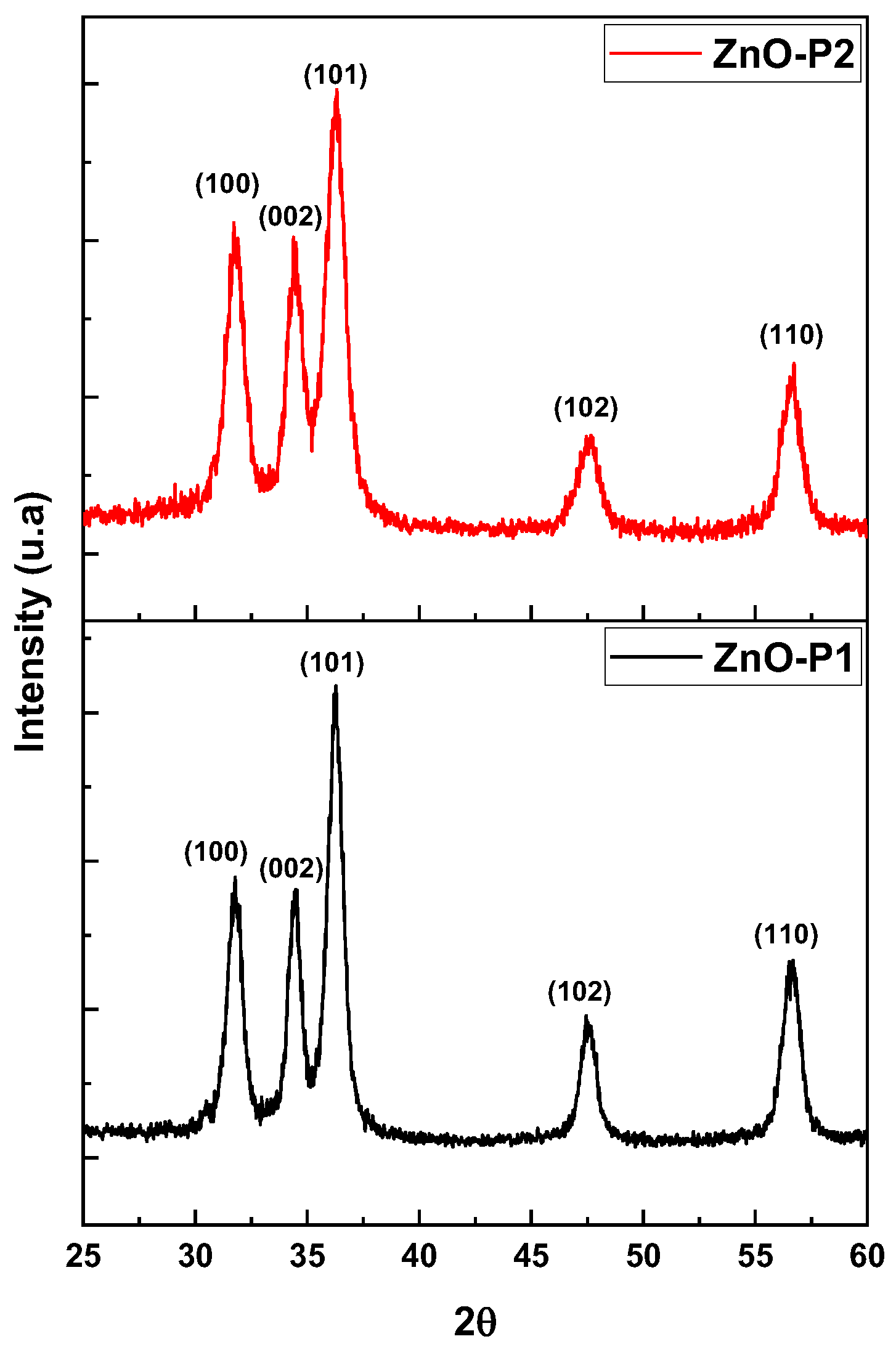 | ZnO-P2 | 8.95 | −101 | a = 3.19 c = 5.15 | 0.0041 | 12.48 | 0.0077 |