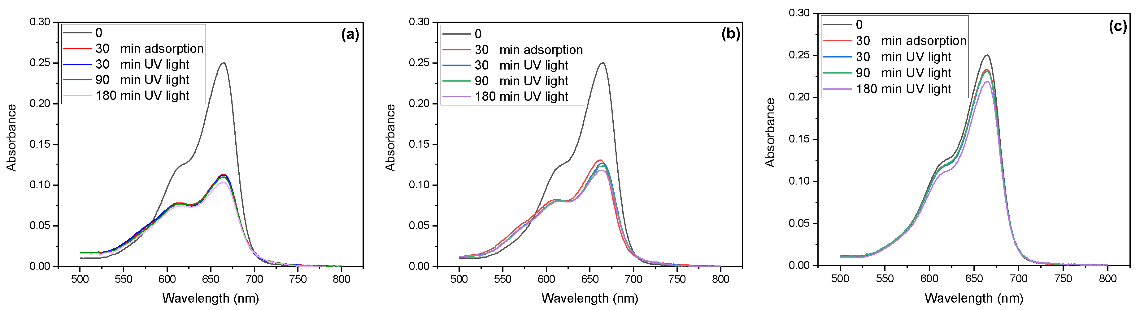 - Atta, D.; Wahab, H.A.; Ibrahim, M.A.; Battisha, I.K. Photocatalytic degradation of methylene blue dye by ZnO nanoparticle thin films, using Sol–gel technique and UV laser irradiation. Sci. Rep. 2024, 14, 26961. [Google Scholar] [CrossRef]