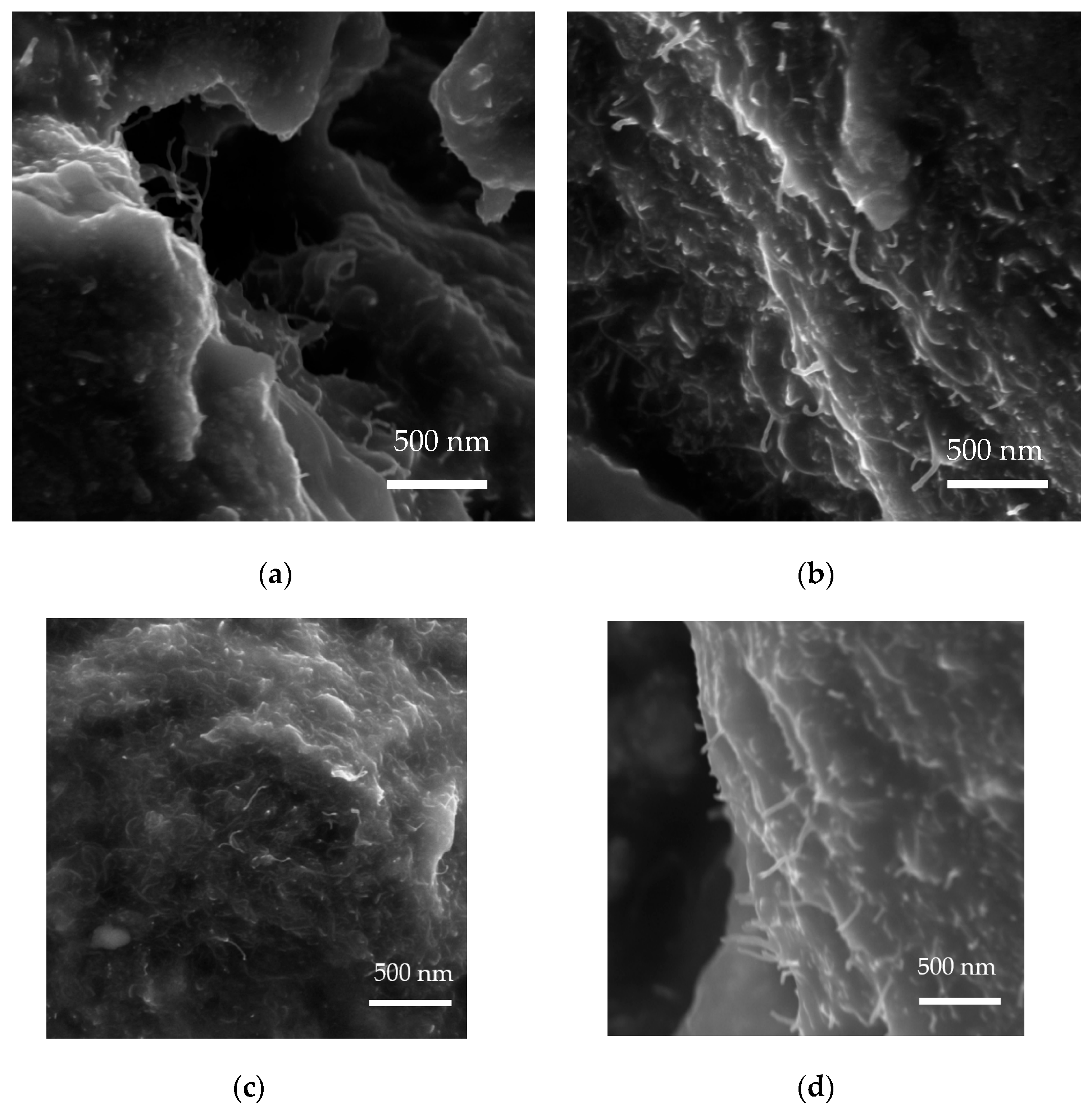 3.1. Analysis of the Morphology and Microstructure of Synthesized CNTs